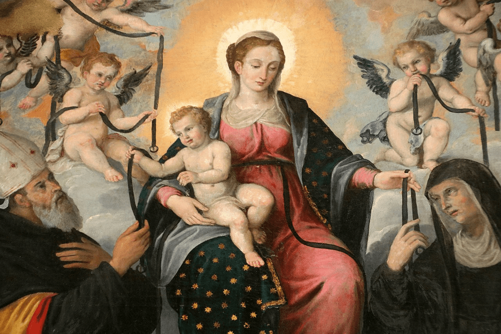 Nas congregações da Ordem Agostiniana, o “Rosário Agostiniano” é às vezes chamado de “Coroa de Nossa Mãe da Consolação”. A representação tradicional nas casas agostinianas mostra Maria segurando o Menino Jesus em seu colo. Ambos seguram o cíngulo agostiniano em suas mãos. [ 4 ]…”: https://en.wikipedia.org/wiki/Our_Lady_of_Consolation