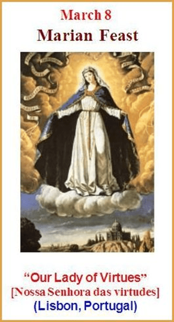 – Ver dia 8 de março, Letra B. OUR LADY OF OUR LADY OF VIRTUES, LISBON, PORTUGAL – OUR LADY OF THE LILY – NOSSA SENHORA DAS VIRTUDES, LISBOA, PORTUGAL