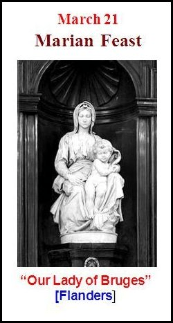 Por precaução, depois que uma bomba foi colocada diante da estátua da Pietá na Basílica de São Pedro em 1972, a Madona de Bruges foi colocada atrás de um vidro à prova de balas, de modo que o público agora só pode admirar a escultura a vários metros de distância…”: https://devotiontoourlady.com/march.html